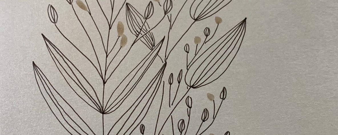 Ein paar Punkte, die in der Anordnung Blätter einer Pflanze, Fruchtstände an Zweigen, Blüten widerspiegeln.